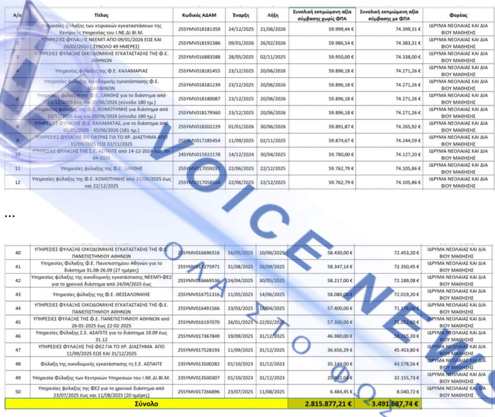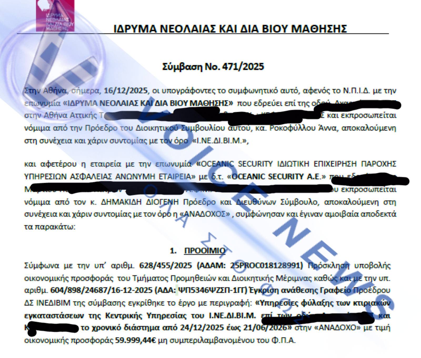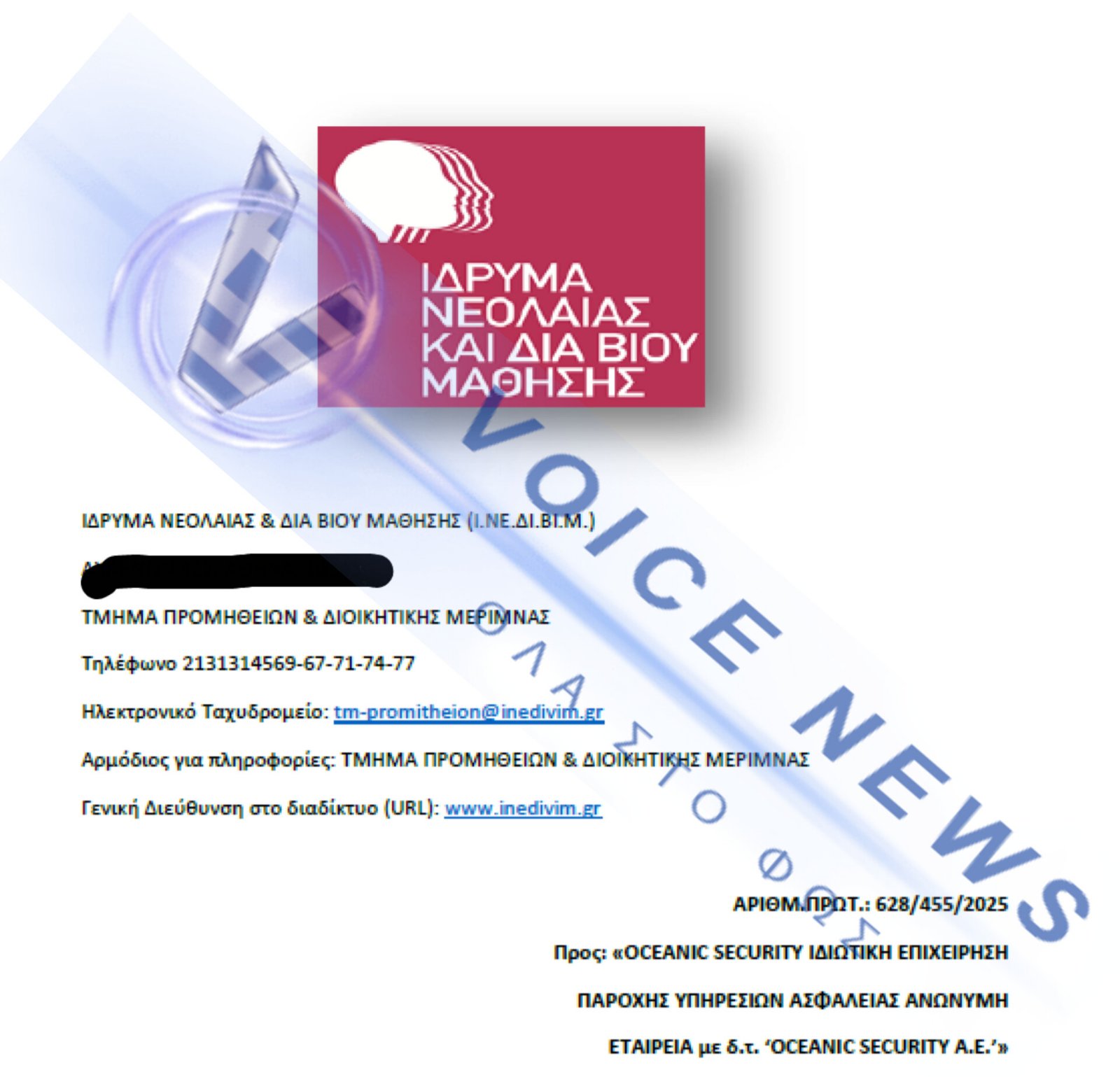 Η εκτεταμένη πρακτική απευθείας αναθέσεων στο ΙΝΕΔΙΒΙΜ φαίνεται πως συνεχίζεται, με τη διοίκηση της Άννας Ροκοφύλλου να βρίσκεται εκ νέου στο επίκεντρο ερωτημάτων για διοικητικές επιλογές που προκαλούν έντονο δημόσιο προβληματισμό. Μετά τις πρόσφατες αποκαλύψεις του Voice News για τις απευθείας αναθέσεις εκατομμυρίων σε εταιρείες catering, το φως της δημοσιότητας βλέπει τώρα μια νέα, προκλητική υπόθεση που αφορά τις υπηρεσίες φύλαξης. 50 Συμβάσεις, Μία Εταιρεία, Μηδέν Ανταγωνισμός Σύμφωνα με τα στοιχεία που προκύπτουν από τον πίνακα των 50 απευθείας αναθέσεων, το ΙΝΕΔΙΒΙΜ έχει «προικίσει» την εταιρεία OCEANIC SECURITY με το ιδιαίτερα υψηλό ποσό των 3.491.687 €. Με βάση τα στοιχεία, φαίνεται να εφαρμόζεται αυτό που στο δίκαιο δημοσίων συμβάσεων λέγεται «κατάτμηση δαπάνης». Πρόκειται για μια διαδικασία όπου ένα ενιαίο φυσικό και οικονομικό αντικείμενο τεμαχίζεται σε μικρότερα κομμάτια, ώστε το καθένα να μην υπερβαίνει το νόμιμο όριο των 60.000 ευρώ, που ισχύει για συγκεκριμένους κωδικούς CPV. Υπενθυμίζεται ότι το γενικό όριο απευθείας ανάθεσης είναι τα 30.000 ευρώ. Με αυτόν τον τρόπο αποφεύγεται η διενέργεια ανοικτού ή διεθνούς διαγωνισμού και γίνονται ονομαστικές προσκλήσεις σε συγκεκριμένο οικονομικό φορέα, χωρίς ανταγωνιστικές προσφορές και χωρίς επαρκή διασφάλιση του δημοσίου συμφέροντος. Πίνακας με το συνολικό ποσό των απευθείας αναθέσεων ποσού 3.491.687 ευρώ, σε μία μόνο εταιρεία την Oceanic Security. Ονομαστική πρόσκληση μόνο στην εταιρεία Oceanic Security με τη διαδικασία της απευθείας ανάθεσης. Η «Σύμπτωση» της Εξαγοράς από τον Όμιλο AKTOR Οι επαναλαμβανόμενες αυτές διοικητικές επιλογές αποκτούν πρόσθετο ενδιαφέρον αν συνδυαστούν με το επιχειρηματικό περιβάλλον εντός του οποίου εξελίσσονται. Η OCEANIC, από τον Μάρτιο του 2025, δεν είναι πια μια τυχαία εταιρεία, αλλά μέλος του πανίσχυρου κατασκευαστικού ομίλου AKTOR συμφερόντων των επιχειρηματιών Μπάκου και Καϋμενάκη, ο οποίος εξαγόρασε το 55% του ομίλου Oceanic Group of Companies έναντι 7,7 εκατ. ευρώ. Η Ανακοίνωση εξαγοράς του 55% του ομίλου Oceanic Group από τον όμιλο AKTOR. Εύλογα τίθεται το ερώτημα αν είναι τυχαίο το γεγονός ότι μια εταιρεία που πλέον ανήκει σε έναν από τους μεγαλύτερους επιχειρηματικούς ομίλους της χώρας συγκεντρώνει το σύνολο σχεδόν των αναθέσεων φύλαξης του ΙΝΕΔΙΒΙΜ, μέσω 50 συνεχόμενων συμβάσεων. Παράλληλα, ανακύπτει το ερώτημα πώς, με επικεφαλής μια έμπειρη νομικό όπως η κ. Ροκοφύλλου, επαναλαμβάνονται διαδικασίες που προκαλούν σοβαρά ερωτήματα και εκθέτουν το ίδρυμα και το υπουργείο. Το ζήτημα λαμβάνει και πολιτική διάσταση, με το ερώτημα να απευθύνεται προς την υπουργό Παιδείας κα Ζαχαράκη, ως εποπτεύουσα αρχή του ΙΝΕΔΙΒΙΜ, για το αν είχε γνώση των συγκεκριμένων πρακτικών και ποια θεσμικά μέτρα προτίθεται να λάβει ώστε να αποτραπεί η επανάληψή τους. Λεζάντα: Μία από τις 50 συνεχόμενες συμβάσεις με την διαδικασία της απευθείας ανάθεσης σε ένα μόνο οικονομικό φορέα, την εταιρεία Oceanic Security. Η εταιρεία Oceanic και ο ιδρυτής της Η Oceanic Group of Companies αποτελεί έναν από τους μεγαλύτερους ομίλους παροχής υπηρεσιών Facility Management, φύλαξης και τεχνικής υποστήριξης στην Ελλάδα, με δραστηριότητα τόσο στον δημόσιο όσο και στον ιδιωτικό τομέα. Ο όμιλος δραστηριοποιείται σε υπηρεσίες ασφάλειας, καθαρισμού και διαχείρισης εγκαταστάσεων, αναλαμβάνοντας συμβάσεις μεγάλης κλίμακας σε φορείς και οργανισμούς. Πίσω από την Oceanic βρίσκεται ο ιδ